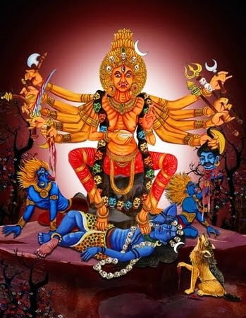 Chamunda, uno de los aspectos de la diosa Kali, es una divinidad considerada implacable y vengadora. A Chamunda se la representa de manera sombría, ya que a pesar de ser una diosa de la guerra su propósito es el de destruir a los demonios, que representan los pensamientos negativos. En los textos antiguos, su figura aparece ocasionalmente como una diosa menor. Sin embargo, con el tiempo, su culto se fue expandiendo y ganando seguidores en toda la India. Hoy en día, adoran a Chamunda en muchos templos y santuarios, y su imagen se encuentra en todo tipo de objetos religiosos.