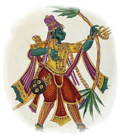 En la definición de Kama, se describe a este dios como hijo de Vishnu y Lakshmi, y es conocido como el dios del deseo y la atracción. Kama es representado armado con un arco, cuya cuerda está formada por abejas, las cuales producen miel. Este detalle simbólico ilustra el deseo, que, al igual que la miel, es dulce pero puede volverse pegajoso o difícil de manejar. Junto al arco, Kama lleva cinco flechas, cada una con una flor distinta: loto, ashoka, mango, loto azul y jazmín. Estas flores representan los cinco sentidos humanos: vista, olfato, gusto, tacto y oído, mostrando cómo el deseo influye en cada uno de estos sentidos.
