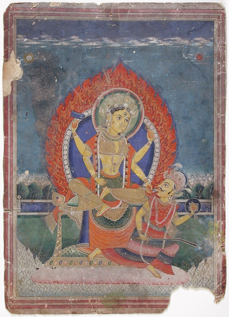 En su mano izquierda agarra la lengua del Asura Madan, y con su mano derecha golpea su cabeza con su cetro.