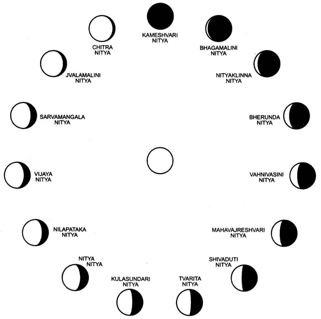 Los Nityas o las Eternidades (o manifestaciones) de Tripura Sundari o Lalita, representan los quince días lunares (denominados tithis en Sanscrito) de la Luna creciente.