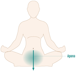 Algunas regiones de nuestro cuerpo están controladas por uno u otro de estos vayu-s. Apana vayu, particularmente estimulado por nuestro ejercicio, responde del área de cintura para abajo. Apana vayu es responsable de la eliminación de la orina, sales, esperma, sangre menstrual y del proceso de nacimiento.