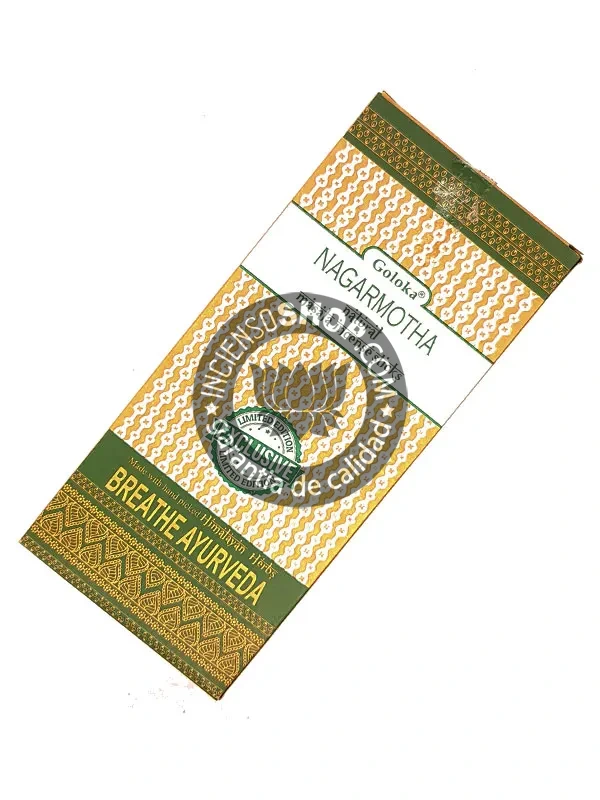 El incienso Goloka nagarmotha es un incienso ayurvédico y orgánico hecho a mano. Pertenece a una edición limitada de inciensos con propiedades medicinales, además es un producto ecológico de la máxima calidad, de gran pureza y con una mezcla tradicional curativa. Dispone de un agradable aroma fuerte, amaderado y ligeramente picante. La nagarmotha es un potente purificante y antimicrobiano, efectivo para aliviar diferentes problemas respiratorios. Además activa el metabolismo, mejora los estados nerviosos y de debilidad física y mental.