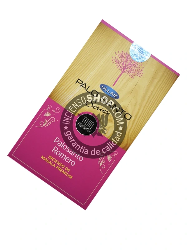 Características y beneficios del incienso de romero y palo santo de Ullas en caja